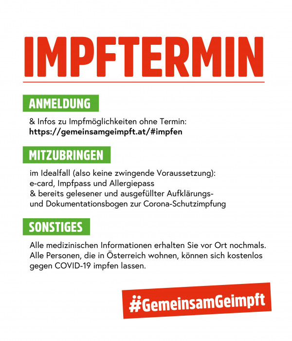In Impfzentren werden die Impftermine meist online oder telefonisch vergeben. Auch das geht rasch und unkompliziert. Für Kurzentschlossene ist das Impfen auch ohne Termin möglich. Alle Angebote zur Corona-Schutzimpfung in Ihrem Bundesland und weiterführende Informationen finden Sie hier.